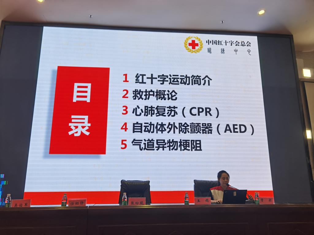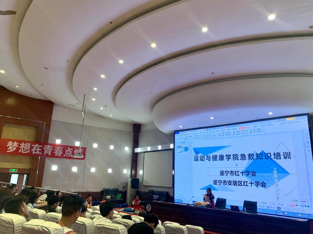 遂甯市紅十字會副秘書長張盼琨、遂甯市安居區紅十字會常務副會長王娟、遂甯市紅十字會辦公室主任任虹靜、遂甯市安居區紅十字會副監事長吳佑軍、遂甯市安居區紅十字會秘書長左詩琪、遂甯市安居區紅十字會赈濟部部長曾穎對運動與健康學院近百名師生進行的急救知識培訓會。此次培訓主要内容為紅十字運動基本知識、救護概念、心肺複蘇術、海姆立克急救法、氣道異物梗阻清除法、骨折固定、傷員搬運護送,繃帶、三角中的使用以及四肢骨折、内外出血、腸溢出等情況的緊急包紮處理、創傷止血包紮技巧意外傷害處置等,培訓老師以理論講解和實操環節相結合開展培訓。